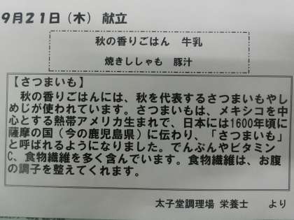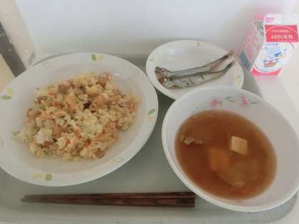 今日の給食は「秋の香りごはん、焼きししゃも、豚汁、牛乳」です。