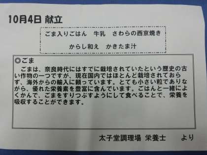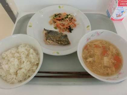 本日の給食は「ごま入りご飯、さわらの西京焼き、からしあえ、かきたま汁、牛乳」です。