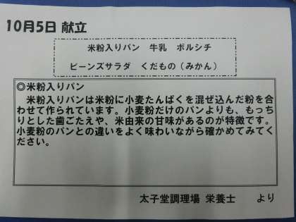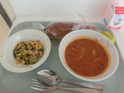 本日の給食は「米粉入りパン、ボルシチ、ビーンズサラダ、くだもの(みかん)、牛乳」です。
