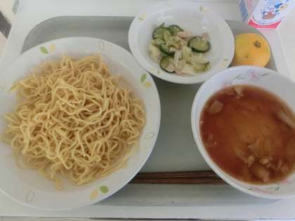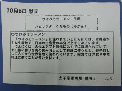 本日の給食は「つけみそラーメン、ハムサラダ、くだもの(みかん)、牛乳」です。