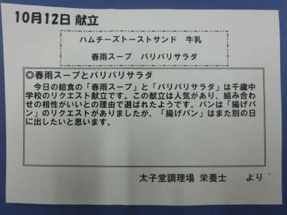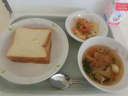 本日の給食は「ハムチーズトーストサンド、春雨スープ、パリパリサラダ、牛乳」です。