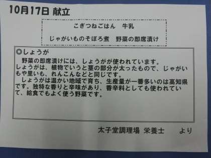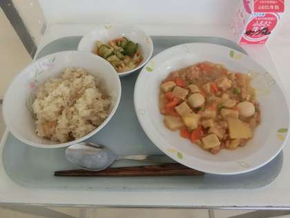 本日の給食は「こぎつねごはん、じゃがいものそぼろ煮、野菜の即席漬け、牛乳」です。