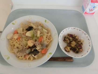 本日の給食は「五目あんかけ焼きそば、お豆かりんとう、牛乳」です。