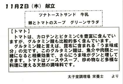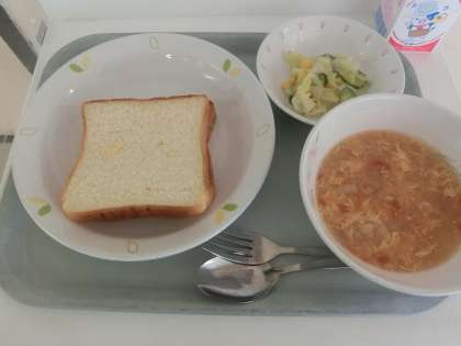 本日の給食は「ツナトーストサンド、卵とトマトのスープ、グリーンサラダ、牛乳」です。