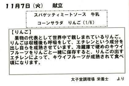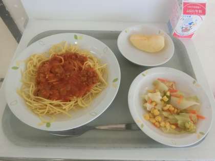 本日の給食は「スパゲッティミートソース、コーンサラダ、りんご、牛乳」です。