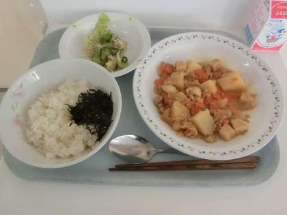 本日の給食は「ごはん、じゃがいものそぼろ煮、ゆかり和え、ひじきふりかけ、牛乳」です