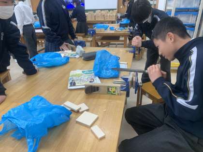 木工練習キットを使って、カンナ削り、やすりの使い方について学びました。