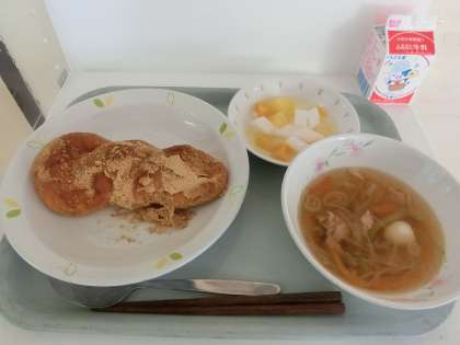 本日の給食は「きな粉揚げパン、春雨スープ、フルーツ入り杏仁豆腐、牛乳」です。
