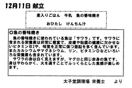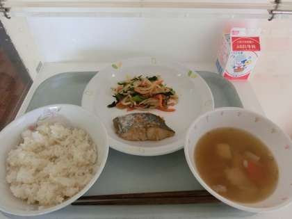 本日の給食は「麦入りごはん、魚の香味焼き、おひたし、けんちん汁、牛乳」です。