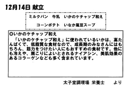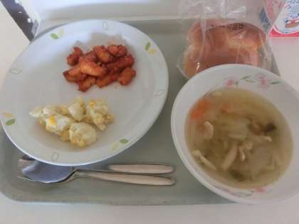 本日の給食は「ミルクパン、いかのケチャップ和え、コーンポテト、いなか風豆スープ、牛乳」です。