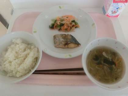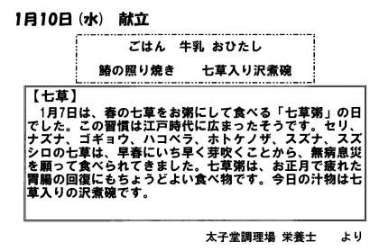 本日の給食は、「ごはん、おひたし、鰆の照り焼き、七草入り沢煮椀、牛乳」です。