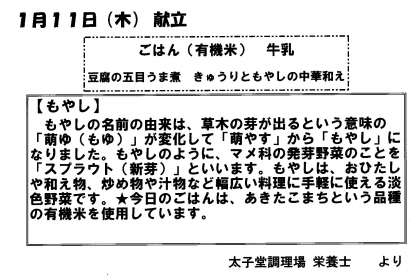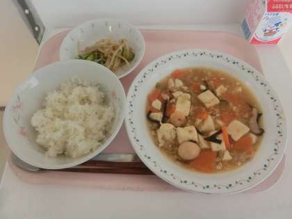 本日の給食は「ごはん(有機米)、豆腐の五目うま煮、きゅうりともやしの中華和え、牛乳」です。