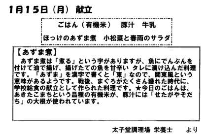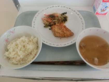 本日の給食は「ごはん(有機米)、豚汁、ほっけのあずま煮、小松菜と春雨のサラダ、牛乳」です。