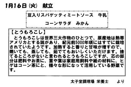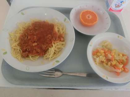 本日の給食は「豆入りスパゲッティミートソース、コーンサラダ、みかん、牛乳」です