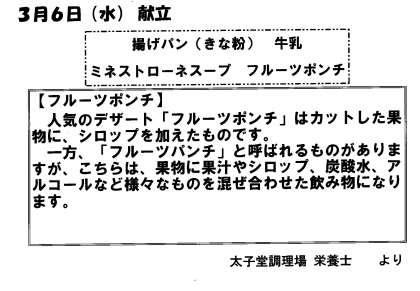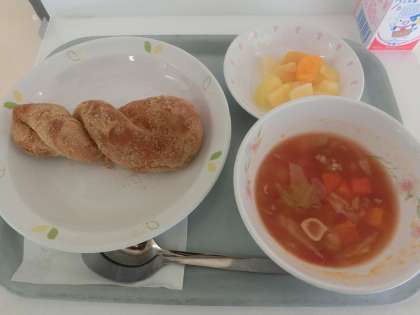 本日の給食は「揚げパン(きな粉)、ミネストローネ、フルーツポンチ、牛乳」です。