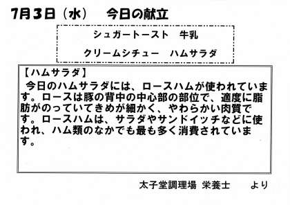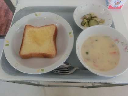 本日の給食は、「シュガートースト、クリームシチュー、ハムサラダ、牛乳」です。
