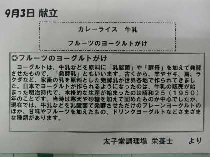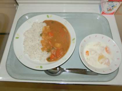 本日の給食は、「カレーライス、フルーツのヨーグルトがけ、牛乳」です。