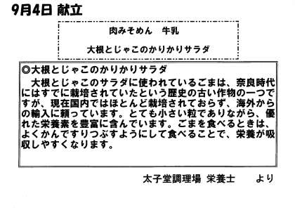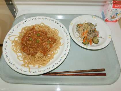 本日の給食は、「肉みそめん、大根とじゃこのかりかりサラダ、牛乳」です。