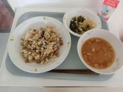 本日の給食は、「大豆入りひじきごはん、さつま汁、わかめサラダ、牛乳」です。