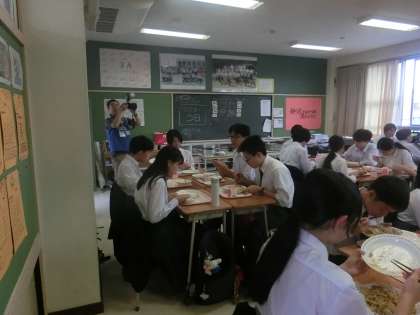 卒業アルバム用の三年生の給食の様子を撮っています。