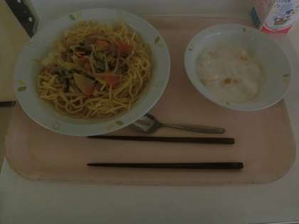 本日の給食は、「五目あんかけ焼きそば、フルーツのヨーグルトかけ、牛乳」です。