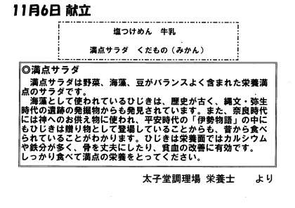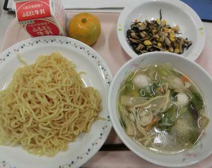 本日の給食は、「塩つけめん、満点サラダ、くだもの(みかん)、牛乳」です。