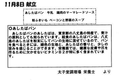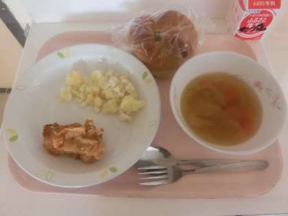 本日の給食は、「あしたばパン、鶏肉のマーマレードソース、粉ふきいも、ベーコンと野菜のスープ、牛乳」です。