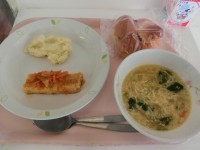 本日の給食は、「スパゲッティクリームソース、キャンディーポテト、牛乳です。」