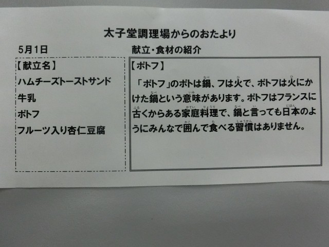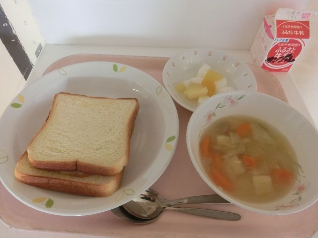 本日の給食は、「ハムチーズトーストサンド、ポトフ、フルーツ入り杏仁豆腐、牛乳」です。