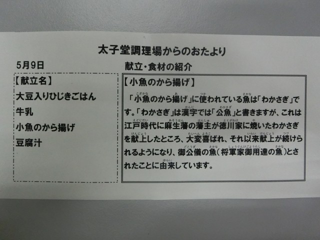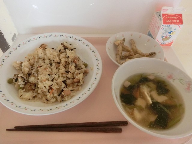 本日の給食は、「大豆入りひじきごはん、小魚のから揚げ、豆腐汁、牛乳」です。