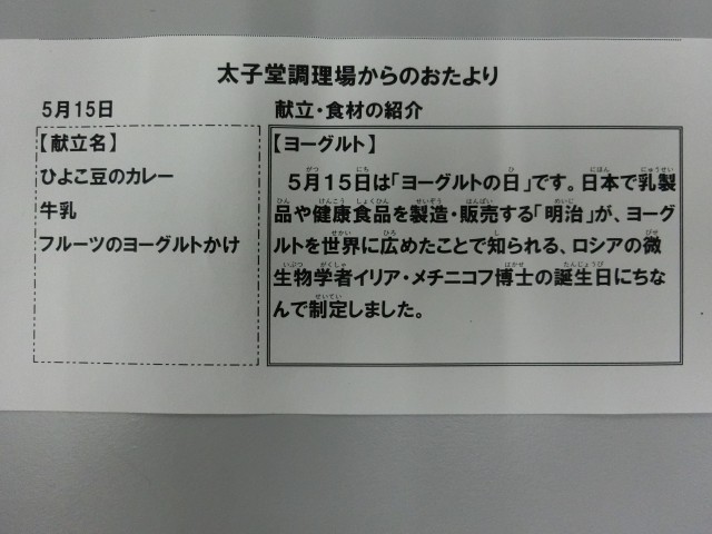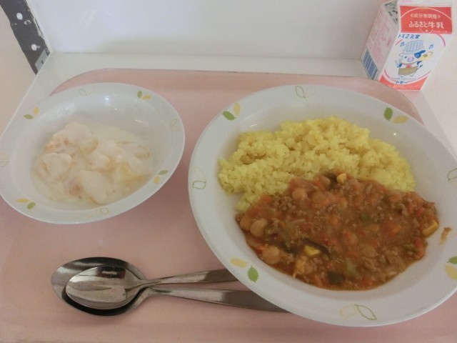 本日の給食は、「ひよこ豆のカレー、フルーツのヨーグルトかけ、牛乳」です。