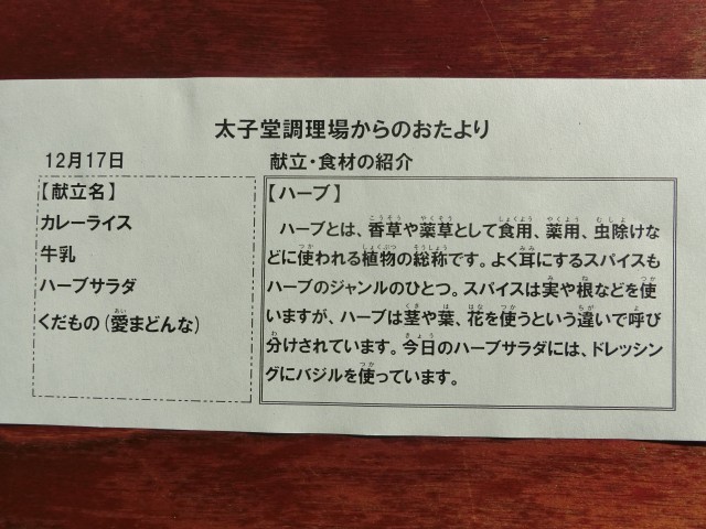 本日の給食は、「カレーライス、ハーブサラダ、くだもの(愛まどんな)、牛乳」です