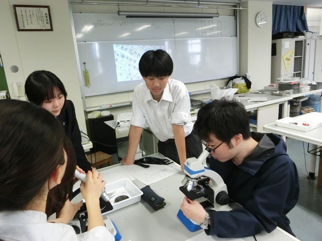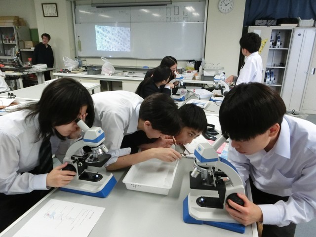 玉ねぎの根の先端の細胞を染色し、細胞分裂の様子を顕微鏡で観察しました