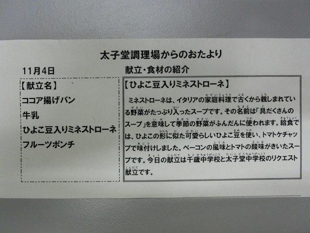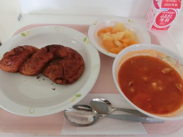 本日の給食は、「ココア揚げパン、ひよこ豆入りミネストローネ、フルーツポンチ、牛乳」です