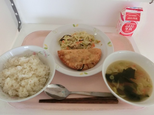 本日の給食は、「ごま入りごはん、ジャンボぎょうざ、ビーフンソテー、わかめスープ、牛乳」です