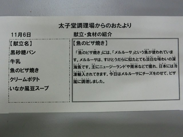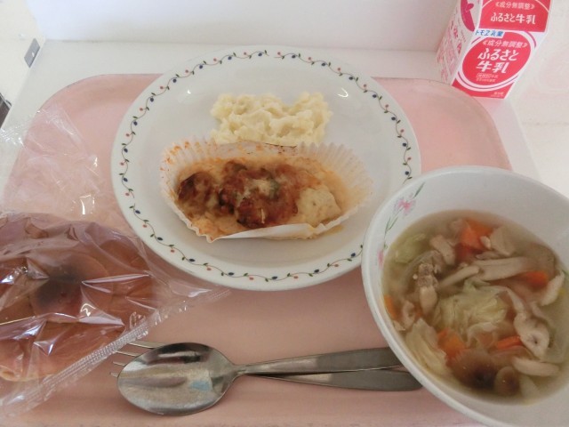 本日の給食は、「黒砂糖パン、魚のピザ焼き、クリームポテト、いなか風豆スープ、牛乳」です