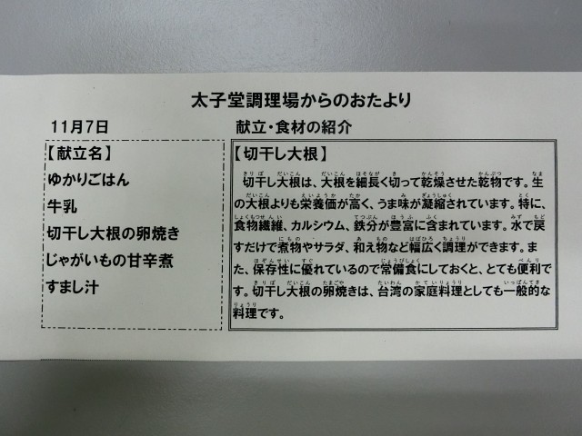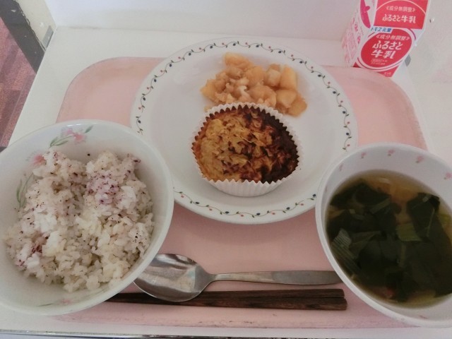 本日の給食は、「ゆかりごはん、切干し大根の卵焼き、じゃがいもの甘辛煮、すまし汁、牛乳」です