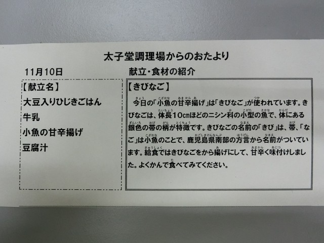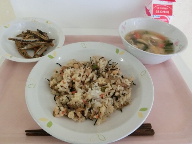 本日の給食は、「大豆入りひじきごはん、小魚の甘辛揚げ、豆腐汁、牛乳」です