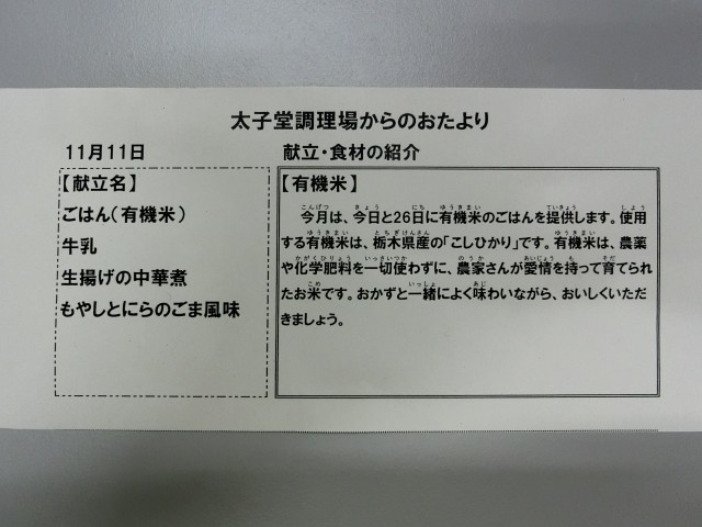 本日の給食は、「ごはん(有機米)、生揚げの中華煮、もやしとにらのごま風味、牛乳」です