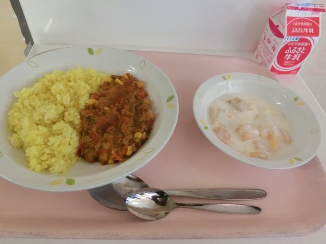 本日の給食は、「ひよこ豆のカレー、フルーツのヨーグルトがけ、牛乳」です