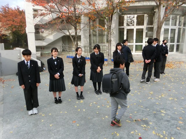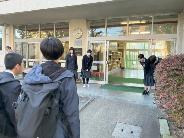 太子堂中学校の生徒が太子堂小学校へ行き、朝の挨拶運動を行いました。朝晩寒くなりましたが、元気な「おはようございます」の声がたくさん聞こえていました。