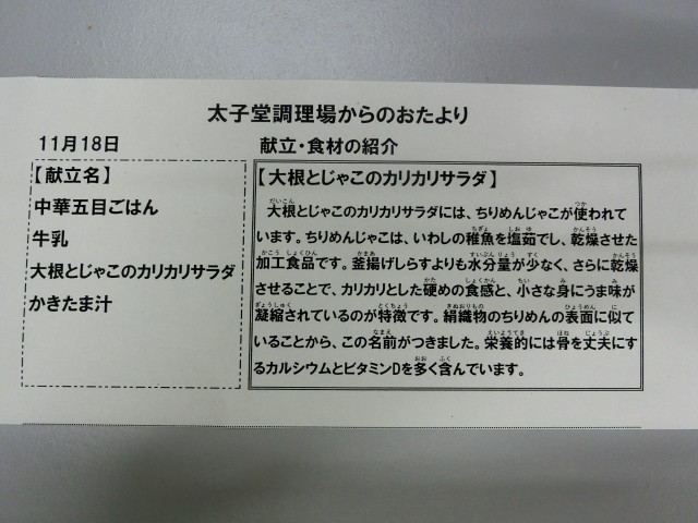 本日の給食は、「中華五目ごはん、大根とじゃこのカリカリサラダ、かきたま汁、牛乳」です