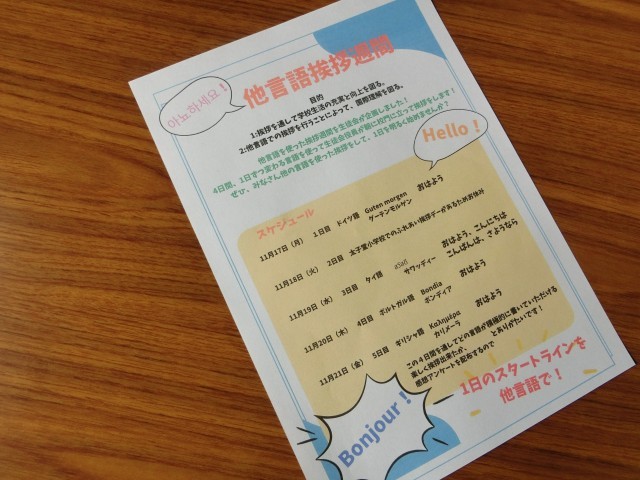 生徒会企画により、他言語挨拶週間が始まりました。世界の挨拶をすることで、異文化理解を深めます。朝の挨拶は、11月17日~21日の間、校門で行われています。