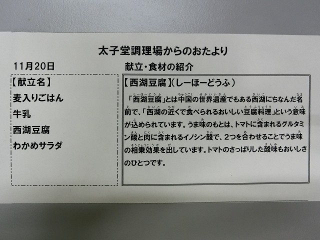 本日の給食は、「麦入りごはん、西湖豆腐、わかめサラダ、牛乳」です