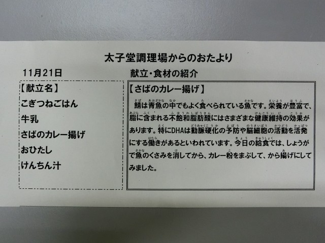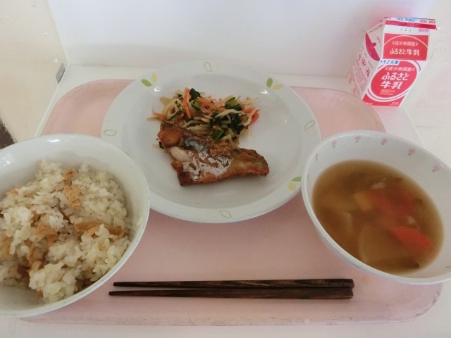 本日の給食は、「こぎつねごはん、さばのカレー揚げ、おひたし、けんちん汁、牛乳」です