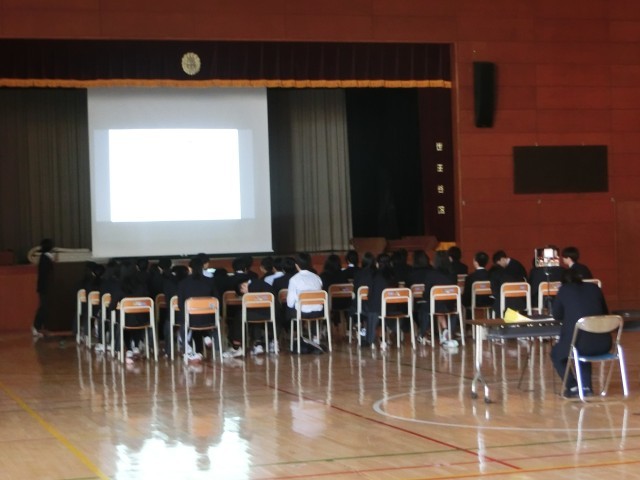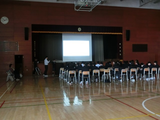 職場体験事後学習の発表会が行われました。職場の概要や、体験してわかった仕事のやりがいなど、パワーポイントを使って発表を行いました。発表後、評価シートにより優秀な発表者を投票します。