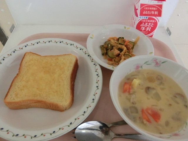 本日の給食は、「はちみつレモントースト、さつまいものシチュー、イタリアンサラダ、牛乳」です