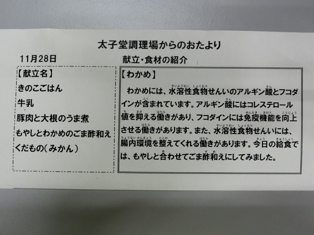 本日の給食は、「きのこごはん、豚肉と大根のうま煮、もやしとわかめのごま酢和え、くだもの(みかん)、牛乳」です