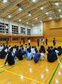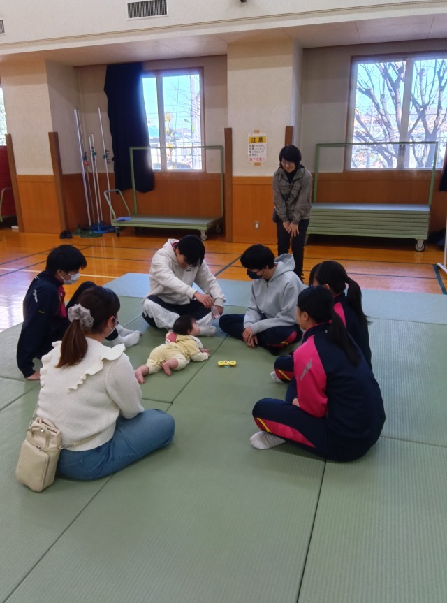 家庭科の授業で、赤ちゃんとご家族によるボランティアさんたちのご協力で保育の体験授...