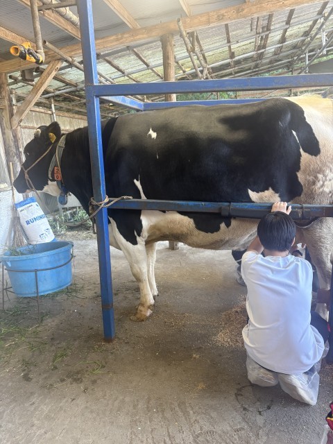 松本牧場さんで、酪農体験。乳搾りや餌やり、背中をブラシで擦ってあげたり。バター作...